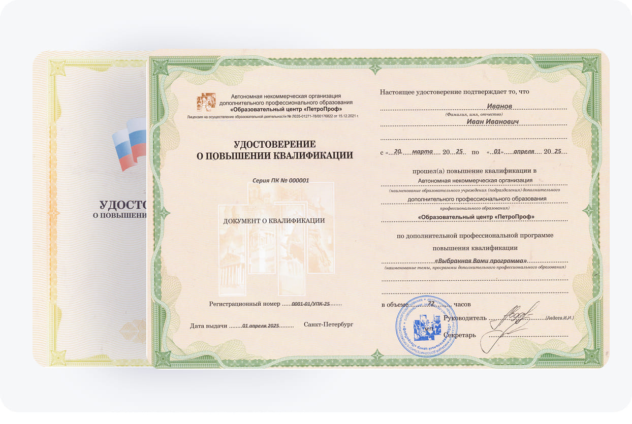 По завершении курса и аттестации слушатели получают официальное удостоверение о повышении квалификации (УПК). Наш учебный центр обладает лицензией на выдачу документов о дополнительном профессиональном образовании, выданной Министерством РФ. Мы гарантируем высокое качество предоставляемых образовательных услуг и юридически значимый документ государственного образца.